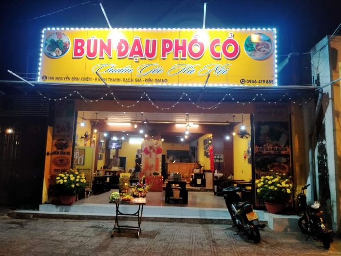 Bún Đậu Phố Cổ is a popular and affordable dining spot loved by many locals in Rạch Giá. The menu offers a wide variety of options including hot pots, chicken, beef dishes, and rice, with bún đậu priced according to portion size – ranging from 40,000 to 120,000 VND. The restaurant has a simple and unpretentious design, with bamboo walls that give it a charming local feel. Despite the lack of focus on decoration, cleanliness is always a top priority. A basic serving of bún đậu includes fragrant boiled pork, crispy fried tofu, fresh greens, and a rich dipping shrimp paste. The boiled pork comes from the pork knuckle, making it tender and flavorful, with large pieces cut to make each bite satisfying. The tofu is golden brown, crispy on all sides. Bún Đậu Phố Cổ can get quite busy, especially at night, but the portions are served quickly and generously, making it an eye-catching meal. The friendly and prompt service is another factor that keeps customers coming back.