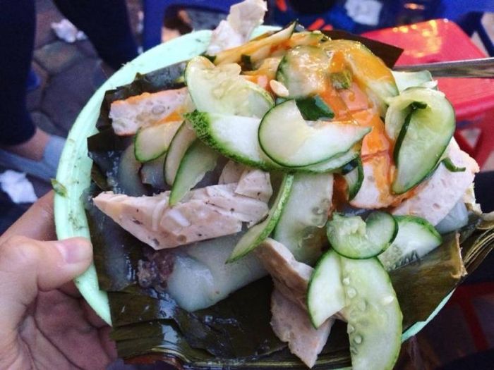 When talking about Gio Cake, it’s a popular dish that most people are familiar with. However, Cô Béo’s Gio Cake in Thụy Khuê offers a unique twist that has won the hearts of locals. A full portion of this cake includes a variety of ingredients like pickled cucumbers and pork skin (Gio Bi), which makes it less dry compared to other places where they use chả or Gio Lua. The cake is served piping hot with a light greenish wrapper and a thin, soft texture. Just a light touch of the spoon reveals the tempting filling of meat and wood ear mushrooms. The wrapper is smooth, tender, and melts effortlessly in your mouth, while the filling is flavorful, tender, and made from fresh ingredients.