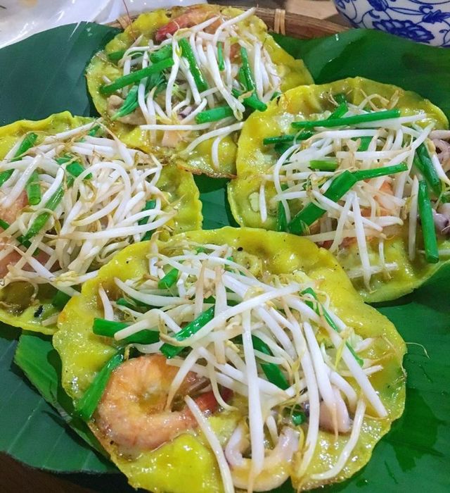 The filling of Vietnamese Sizzling Pancakes typically includes bean sprouts, shrimp, squid, or pork. People in Ninh Thuan enjoy this dish in a unique way: they don’t wrap the pancakes in rice paper with herbs and vegetables; instead, they dip each hot pancake directly into a pre-made dipping sauce. Unlike the large pancakes from the Western region, Phan Rang's sizzling pancakes are small, roughly the size of a bowl's mouth, cooked in small molds within a larger pan (about 4-5 molds). The pancakes are crispy and delicious, with a taste that’s irresistible and will captivate anyone who tries it.