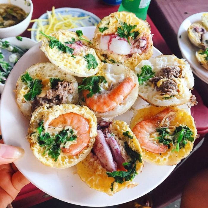 It would be a major omission not to mention Bánh Căn when talking about Vietnamese pancakes. Similar in shape to the Southern bánh khọt, these mini pancakes are made from a mix of rice and glutinous rice flour. They are cooked in small clay molds over hot charcoal. Bánh Căn can be eaten in the same way as bánh xèo, accompanied by a similar dipping sauce. This delicious dish is sure to impress. One of the most popular variations is the Egg Mini Pancake, which is aromatic and beautifully plated, typically served with fermented shrimp paste or fish sauce with peanuts.