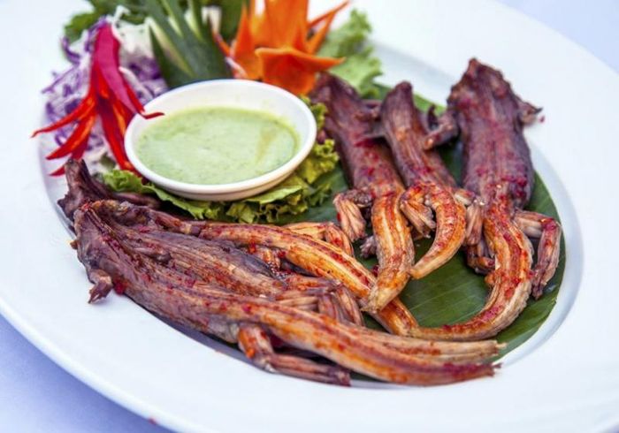 Sand lizards are abundant in the area, and their naturally firm and aromatic meat has made them a beloved dish. Over time, the preparation of sand lizard dishes has become a prestigious specialty, often served to guests during important occasions. The recipe is simple: remove the insides, season with spices, and grill over hot charcoal. Once cooked, the tender meat is dipped in chili salt and enjoyed with fresh herbs and sour banana slices. Sipping a strong drink or a cold beer while savoring this dish offers a truly authentic regional experience. Travelers visiting Ninh Thuận can indulge in this unique dish to discover the culinary traditions of this region.