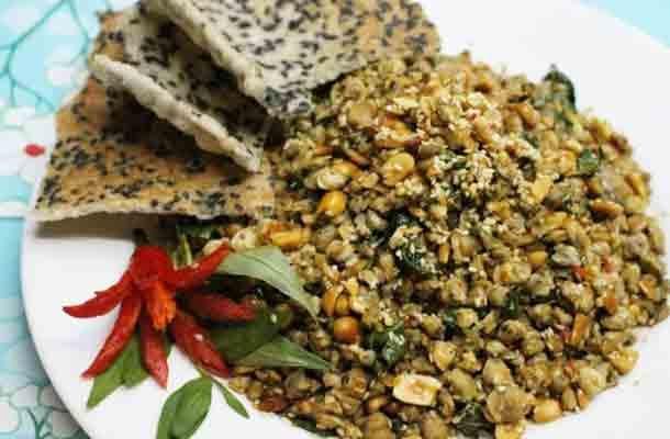 When it comes to the famous dishes of Ha Tinh, we can't overlook Goi Ca Duc, a beloved seafood dish that hails from the coastal region of Xuan Nghi. Ca Duc, measuring about 13-18 cm in length and having a thick body, is found near the shore and resembles a freshwater goby. The fish's firm, white, and sweet meat makes it perfect for a variety of recipes, available almost all year round. To enjoy the best version of Goi Ca Duc, it is traditionally served with fresh herbs such as young mango leaves, wild fig leaves, and mint, along with thinly sliced green mango, sour starfruit, and banana. The fish is wrapped in crispy rice paper with herbs and served with a rich dipping sauce, allowing you to experience the delightful contrast of flavors: the rich fish, the sweetness of coconut, a little heat from chili, and a tangy sweetness that makes this dish one-of-a-kind.