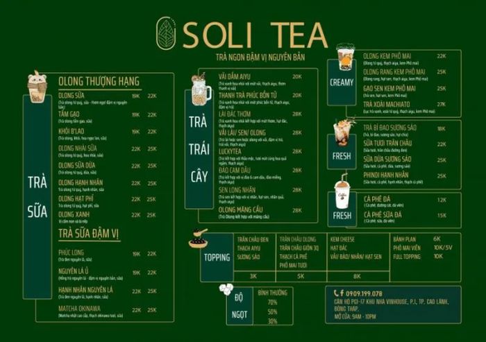 If you love a strong tea flavor, you can't miss "TIỆM TRÀ SOLI VINCOM CAO LÃNH". Soli Tea is known for its premium Oolong teas, perfect for those who enjoy a bold taste with a delicate, slightly sweet fragrance.