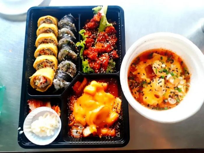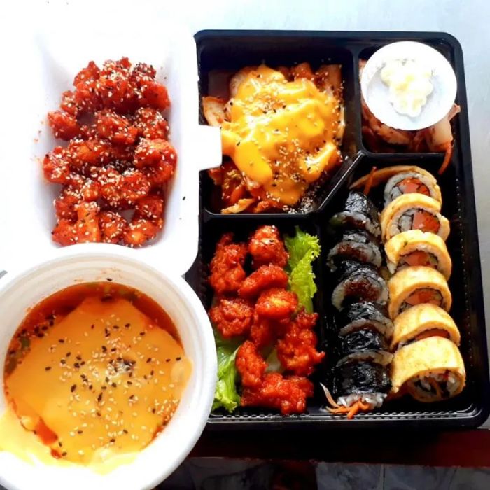 The restaurant serves a variety of dishes, including crispy kimbap, spicy chicken tteokbokki, and mixed rice bowls with beef, mushrooms, cucumber, carrots, vegetables, and eggs, all beautifully arranged. The kimbap here is tightly rolled with a variety of fillings, making it both visually appealing and flavorful. Pairing it with soy sauce or chili sauce brings out the best taste. With its delicious, nutritious food and great presentation, Sushi Thang Bom is a must-visit for Korean food fans. The friendly and enthusiastic staff adds to the overall experience. If you're looking for a place to enjoy diverse, quality snacks, Sushi Thang Bom is the perfect spot!