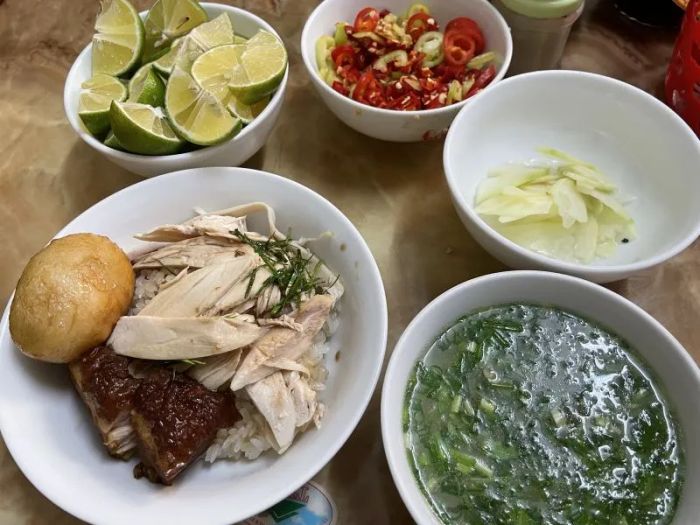 Thanh Vân Family-Style Bánh Cuốn also offers a version with chicken filling, served at a very reasonable price. The thin wraps are stuffed with finely chopped chicken mixed with wood ear mushrooms. The crispy side dishes, also homemade, remain crunchy and fresh, never soggy. The shrimp floss here is finely ground and pairs perfectly with the rice rolls. The overall flavor is rich and fragrant, and you can enhance the taste by dipping the rolls into their signature sauce. While Bánh Cuốn is available at many spots in Hanoi, Thanh Vân Family-Style Bánh Cuốn remains one of the best places to indulge in this delicacy.