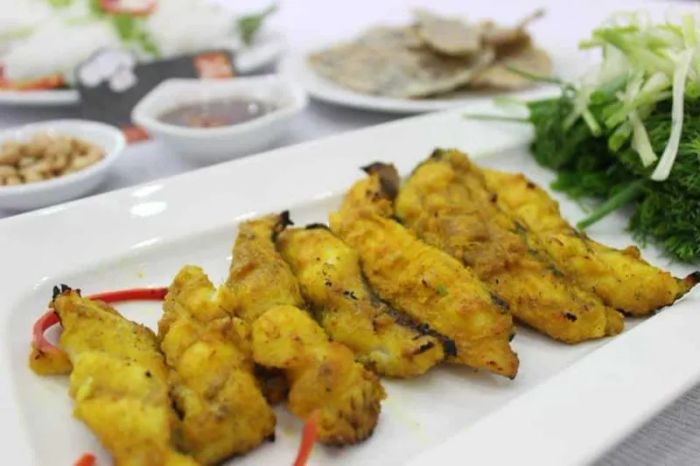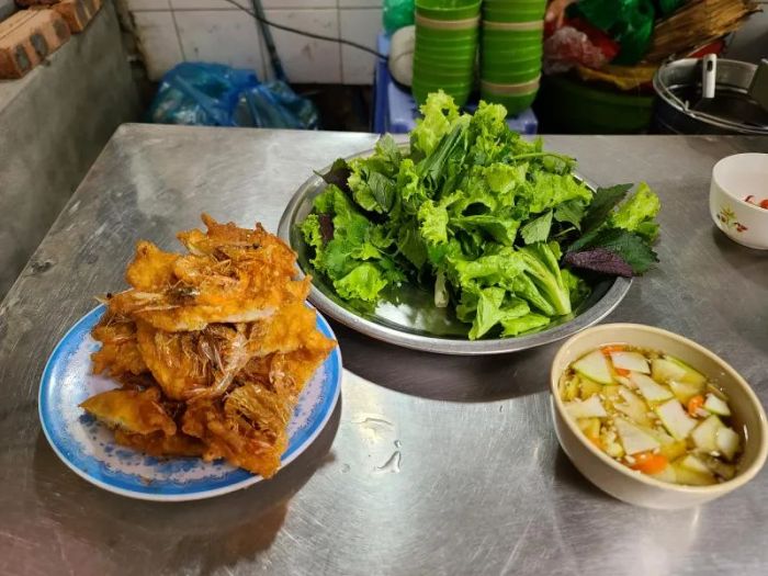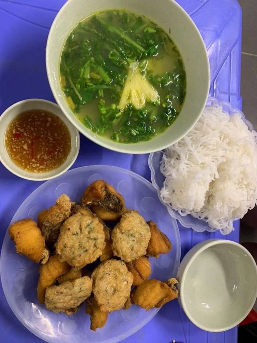 The grilled fish at Cha Ca La Vong is primarily made from snakehead and basa fish, giving it firm, chewy meat that won’t fall apart after being tossed in the pan. The pieces are cut to a perfect size, turning golden and slightly curled when cooked. The crispy exterior contrasts with a tender inside, seasoned just right and infused with a fragrant aroma. The accompanying dipping sauce is not overly salty but retains a subtle, distinctive flavor. The sweet and rich taste of the Cha Ca La Vong, paired with fresh herbs and the salty shrimp paste, makes it irresistible to many.