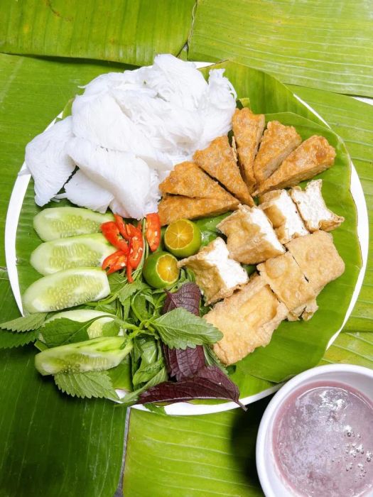 Vermicelli with fried tofu and shrimp paste (Bún đậu mắm tôm) is a cherished traditional dish that has been a part of Hanoi's culinary culture for generations. This dish perfectly blends the finest elements of Vietnamese cuisine, offering a taste that will linger in your memory long after the first bite. The crispy fried tofu, tender savory meatballs, and soft vermicelli wrapped together and dipped in shrimp paste create the legendary flavors of Bún đậu mắm tôm. Known for being one of the best spots for this dish in Hanoi, Bún Đậu Trung Hương, located in Phất Lộc Alley on Hàng Bạc Street, has become a favorite destination for many. What makes this place stand out is its shrimp paste, sourced from Thanh Hóa, which has a fragrant, pinkish hue and is expertly blended by the owner.