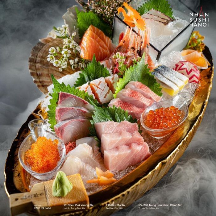 Located on the bustling Triệu Việt Vương Street, Nhân Sushi is easily accessible and stands out as one of the top Japanese restaurants in Hanoi, having expanded from its successful origins in Saigon. The restaurant features a spacious and elegantly decorated interior that embodies the essence of Japanese style. For those looking for a more intimate dining experience, there are private rooms adorned with flowers, candles, and soothing music, creating a cozy atmosphere.