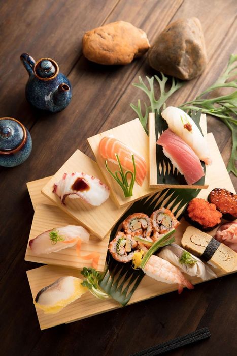 - Authentic sushi including California rolls, salmon maki, tuna nigiri, eel nigiri, and shrimp nigiri.