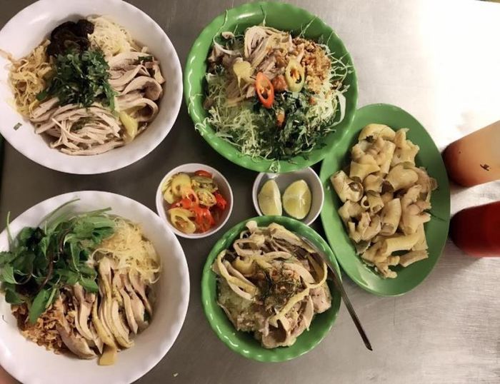The signature dish at Pho Hanh - Lan Ong is the chicken pho salad. In addition to the soft pho noodles, the dish includes shredded chicken, fresh herbs, crispy fried onions, roasted peanuts, and a drizzle of chicken fat along with a few special seasonings. This combination creates a rich flavor that is savory yet not greasy. To balance the texture, the dish is served with a bowl of flavorful chicken broth, which enhances the taste and keeps the pho from being too dry. Pho Hanh also serves a variety of chicken dishes, including shredded chicken pho, chicken drumstick pho, chicken rice with pate, chicken vermicelli, and chicken noodles, all of which are favorites of the regular patrons.