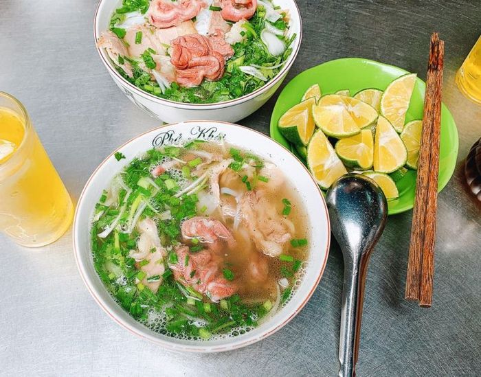Located at 50C Hang Vai, Hoan Kiem, Pho Khoi Hoi has become a beloved spot for locals in Hanoi. Known for its traditional pho and beef dishes, the restaurant’s secret lies in its unique broth. According to the owner, the recipe is a family tradition dating back to the Mau Dich era. The broth is made by simmering beef bones with spices such as cardamom, cloves, cinnamon, ginger, and star anise, resulting in a delicate, rich, and subtly sweet flavor. The meat, freshly sliced upon order, stands out for its thickness and tenderness, especially the lightly cooked beef shank, which is juicy and firm.