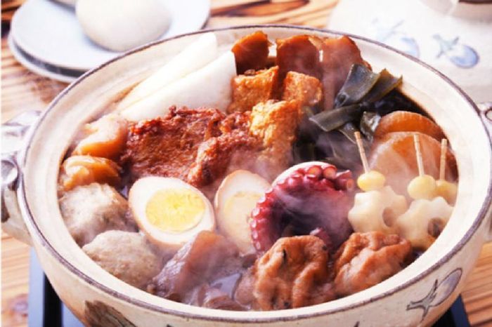 Oden is a traditional Japanese dish served in a hot pot, consisting of various ingredients such as boiled eggs, daikon radish, konjac, and fish cakes, all simmered in a light dashi broth flavored with soy sauce. The ingredients can vary by region and household. Karashi (Japanese mustard) is commonly used as a condiment. Oden is often sold in food stalls, offering a warm and comforting meal during colder seasons.