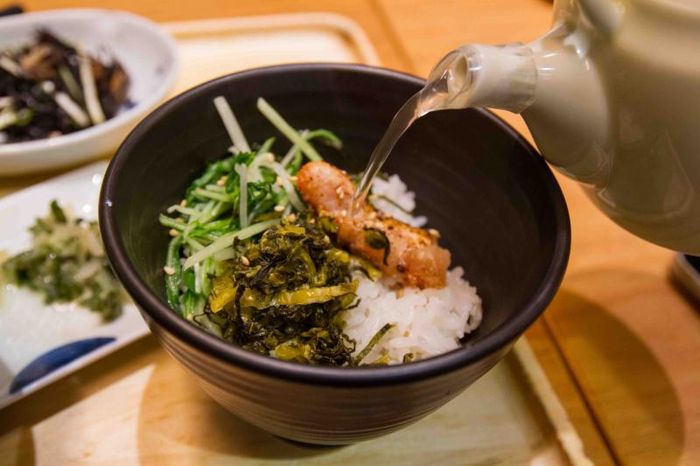 Eating this dish is a ritualistic experience in itself. First, the fish and rice are mixed with soy sauce and wasabi, followed by pickled vegetables. Once most of the mixture is enjoyed, a little dashi (broth) is poured into the remaining rice, transforming the dish into a savory soup. This process adds another layer of depth and flavor, making the meal an even more delightful experience.
