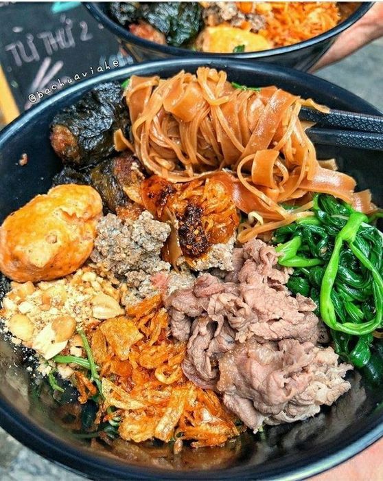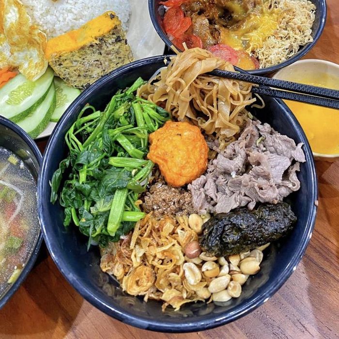 What really sets Trộn - Authentic Crab Noodle apart is its crispy fried onions, which fill the street with their irresistible aroma. Some must-try dishes at Trộn include: crab noodle with shrimp, mixed noodle, crab noodle, and shrimp noodle, all priced from 60,000 VND. The servings are generous, beautifully presented, and perfect for Instagram photos. When you eat here, you’ll love the rich, fragrant broth, the firm bánh đa noodles that stay chewy, and the delicious fried onions, mỡ hành, and grilled minced pork wrapped in leaves.
