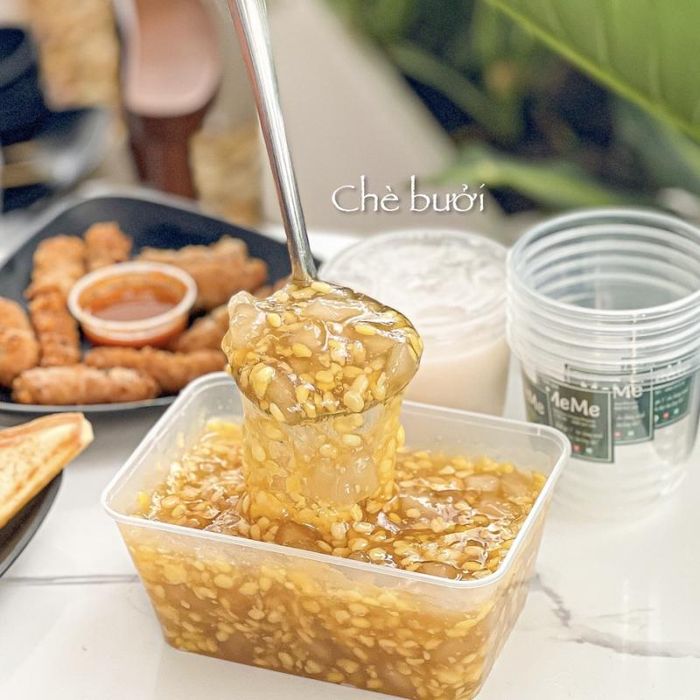 If you're a fan of che, don't miss Che To Candy. This shop is a hotspot for snack lovers, offering a variety of unique che options like mixed che, pomelo che, thot not che, durian Thai che, avocado che, and more. The standout feature of Che To Candy is its generous and visually appealing servings. Here, you can enjoy traditional-style pomelo che with soft mung beans, rich coconut milk, and crispy pomelo rind. Each spoonful of che contains a few pieces of diced pomelo, creating a delightful crunch. The coconut milk enhances the flavor, making the pomelo che even more fragrant and tasty.