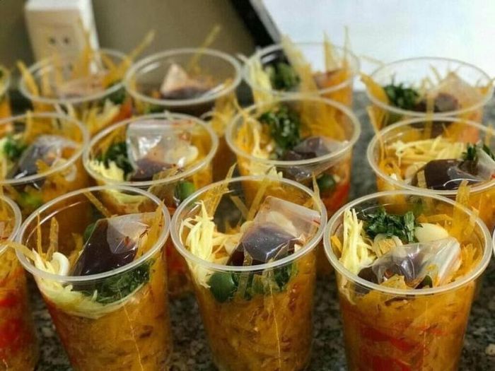 Another fantastic place to enjoy delicious mixed rice paper in Thanh Hoa is located in the bustling apartment complex on Chu Van An Street. The mixed rice paper at Linh Doan Rice Paper is quite unique. The rice paper is served separately in a clean plastic bag, and instead of the usual chili oil or beef sauce, they use a flavorful shallot oil. However, for those who prefer the traditional taste, they also provide a packet of beef sauce on the side to mix in. This special twist is what has made this place so popular. The shop tends to get very busy, so expect to wait in line if you want to buy. People often buy in bulk, with some ordering up to 10 bags at a time. But don’t let that discourage you from experiencing this distinctive mixed rice paper! A single un-mixed portion costs 20,000 VND, and each package comes with green mango, sauce, dried beef, and Vietnamese coriander. The menu here is extensive, offering items like rice paper rolls, extra rice paper, and dried squid. One thing to keep in mind is that delivery only starts at orders over 100,000 VND.