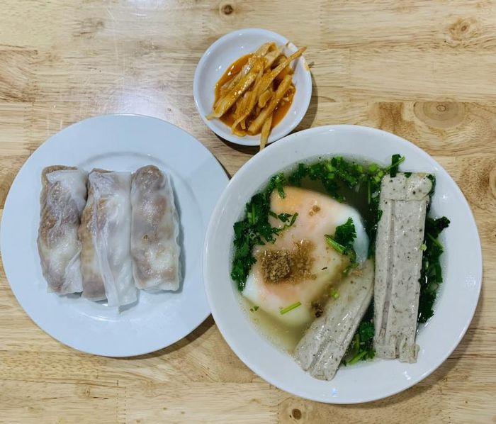 One of the must-visit places for hot and delicious bánh cuốn is Tiệm Bánh Cuốn Hiền Bá. This long-established shop attracts loyal customers with the quality of its food. The restaurant is known for its cleanliness, with all dishes and ingredients made from scratch. The bánh cuốn is always served fresh and hot, as the chef prepares it right when you order—a great plus for this eatery.