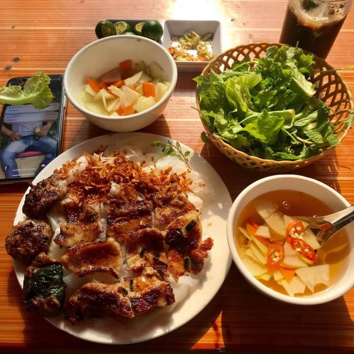 The ingredients used are fresh and well-seasoned, ensuring a perfect flavor profile that’s both simple and delicate, without being overwhelming. The bánh cuốn is wrapped in a smooth, white rice wrapper that carries the enticing fragrance of steamed rice. Immerse each piece into the dipping sauce and enjoy it with tender grilled pork for an unforgettable experience. The grilled meatballs are made from fresh, thinly sliced pork belly, marinated to perfection, and skewered before being grilled over hot charcoal. The result is juicy, tender meat that’s slightly crispy on the outside and bursting with flavor inside.
