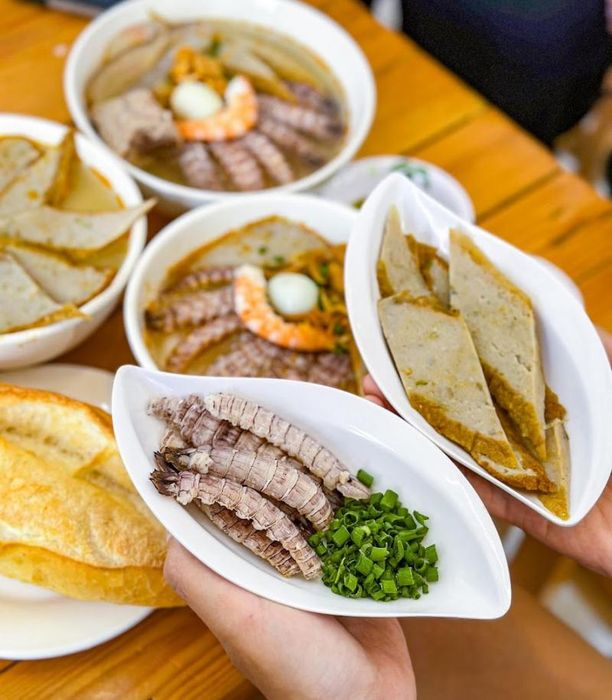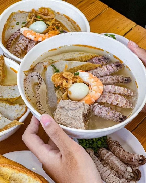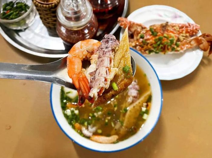 The rich, fragrant broth of bánh canh with its amber hue, combined with luxurious lobster, makes this dish irresistible. You simply cannot miss the lobster bánh canh at Quán Bánh Canh Tôm Hùm Quán Nhỏ Nha Trang. The owner of this spot was the first to create the lobster bánh canh, sparking a culinary sensation among food enthusiasts. This is why many celebrities such as Lam Trường, Bằng Kiều, Thanh Hà, actor Kiến An, MC Nguyên Khang, FPT's Hoàng Nam Tiến, and popular TikTokers like Hưng Huỳnh frequent here, praising the dish for its exquisite flavor.