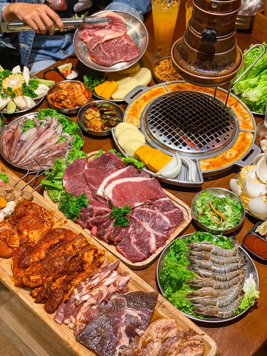 This grilled buffet restaurant usually serves sets for 2-3 people, 4-6 people with many options such as pork belly, pork collar, beef chuck, beef belly, beef ribeye, accompanied by pachan and dipping sauce. The accompanying foods include vegetables, kimchi, corn, salad that you can take unlimitedly at the restaurant's buffet line.