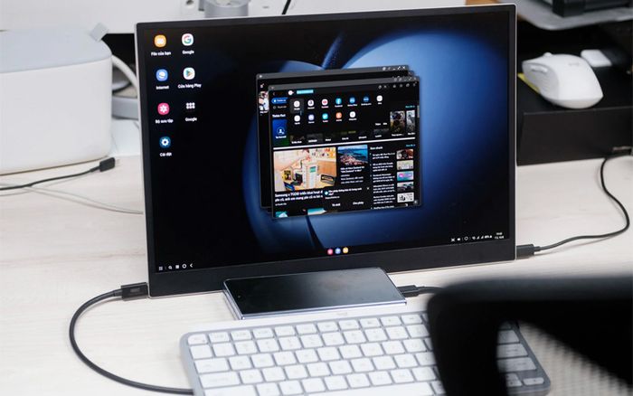 Samsung Dex serves as a tool to easily connect your device to a computer monitor, boosting work productivity and efficiency. Simply use a USB-C adapter to connect an HDMI cable to the monitor, along with a mouse and keyboard or laptop, and you can connect effortlessly. Projecting onto a large screen greatly aids in presentations and document viewing for users.