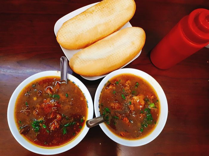 For Hanoians, wine sauce baguette is a familiar and enticing late-night snack. In particular, Dinh Ngang's wine sauce baguette is a budget-friendly evening dining spot in Hanoi chosen by many. The owner, Tram, is extremely passionate and her exceptional culinary skills create this appealing baguette. The rich wine sauce, harmoniously combined, is the most alluring aspect of the flavor. Accompanied by crispy beef tendons and fresh condiments such as herbs, cucumbers, and pickles.
