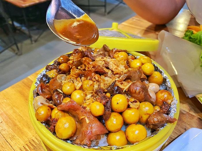 Vi Quan serves a distinctive dish featuring goat, goat's stomach, and roasted garlic-infused eggs. These three ingredients are expertly cooked on a cast-iron pan, ensuring high temperature during cooking while retaining warmth afterward. For just 138,000 VND, you and your friends can indulge in a sizzling pan of crispy goat stomach, fragrant and soft eggs, and flavorful garlic-roasted goat. The moment you step into the restaurant, the irresistible aroma envelops you. This dish is not only delicious but also nutritious for all ages.