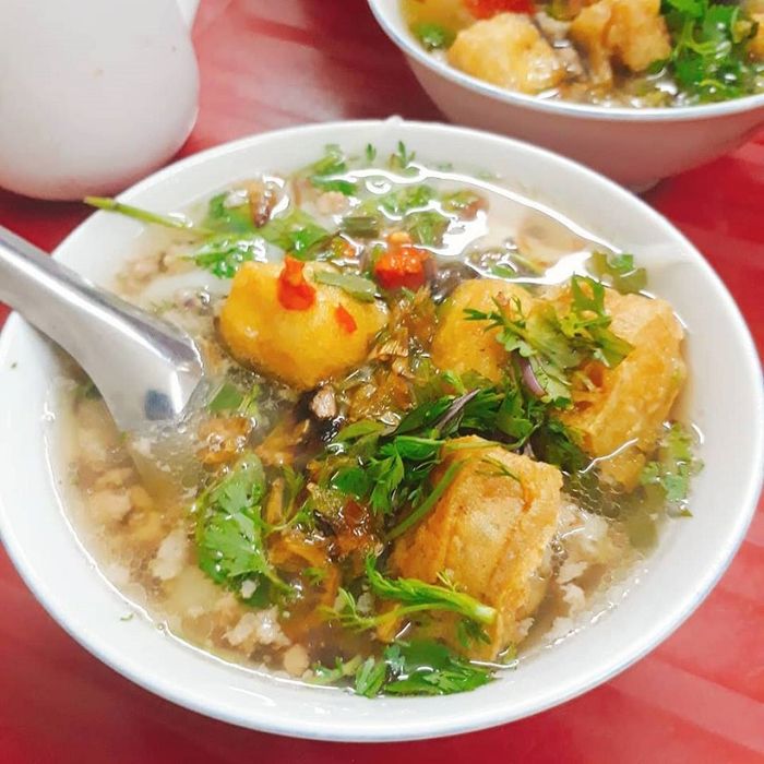 Wondering what to eat on a Hanoi night? The answer is to definitely try the Hot Rice Flour Cake on Le Ngoc Han Street. This establishment, with decades of history, is familiar to many Hanoians, from students, and office workers to laborers. Hot Rice Flour Cake is also a well-known dish in many Vietnamese rural areas. The steaming Hot Rice Flour Cake is served with minced meat sautéed with wood ear mushrooms and fragrant mushrooms. Topped with finely chopped cilantro and crispy fried shallots on the side, the cake is enjoyed for its chewy texture and rich broth. Despite being crowded, the shop provides ample seating for customers to relax and indulge in the dish.