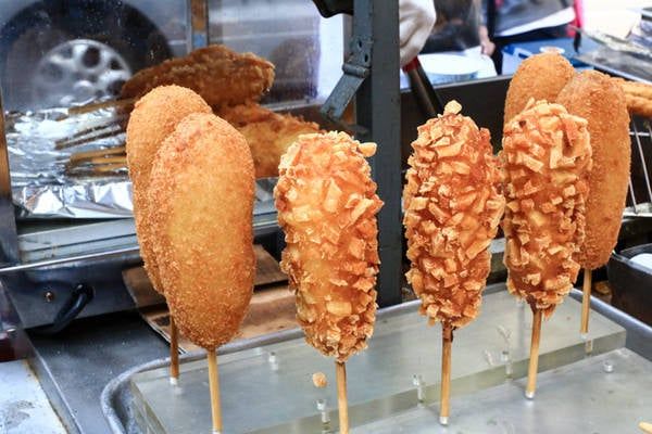 Korean Kogo is a popular street food found throughout the sidewalks of South Korea. It combines hotdogs and french fries. Instead of using bread as in American-style hotdogs, vendors here coat a thin layer of batter and cover it with countless potato 'seeds,' giving the dish a resemblance to corn on the cob.