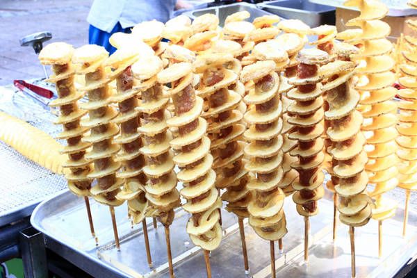 Spiral potato is a popular snack in South Korea. The making process is quite simple, potatoes are cut and formed into spiral shapes, then deep-fried until crispy, coated with cheese powder on the outside, and skewered into long sticks.