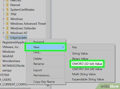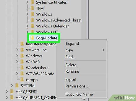 - If you cannot find an 'EdgeUpdate' folder within the Microsoft directory, generate it by right-clicking 'Microsoft' and selecting 'New > Key.' Name it EdgeUpdate and proceed.