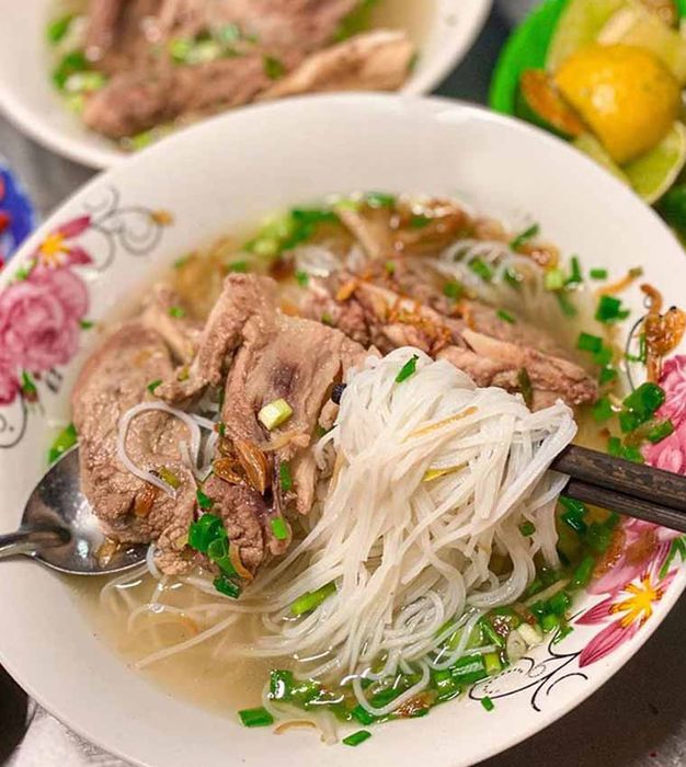 With this method of cooking beef bone noodle soup, the broth has a sweet and savory taste, the fresh noodles are soft, complementing the tender pork, crispy squid, plump shrimp, and quail eggs. If you prefer a sour taste, you can add a few slices of fresh lime to the side salad.