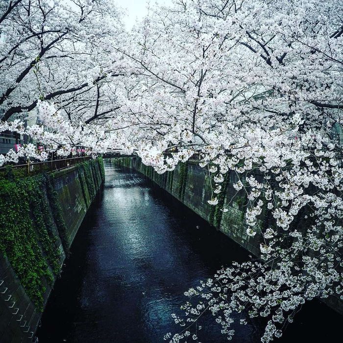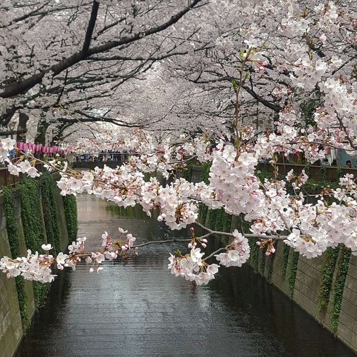 Cherry blossom trees lining the Meguro River. @internet