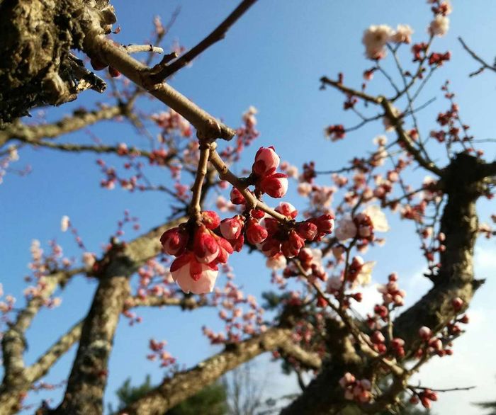 The vibrant colors of cherry blossoms shine brightly under the spring sky. @internet