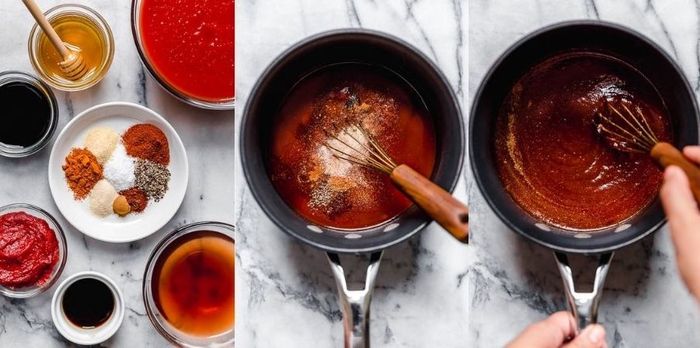 - Mix a small bowl of tomato sauce, ¼ cup of water, ¼ cup of rice vinegar, ¼ cup of brown sugar, 3 teaspoons of olive oil, 1 teaspoon of black pepper, 1 teaspoon of chili powder, and 2 finely chopped garlic cloves.