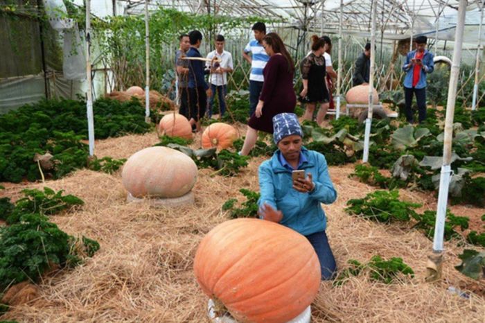 In Da Lat, there are numerous places growing pumpkins, but the giant pumpkin garden of Mr. Phan's family stands out with three types of giant pumpkins weighing up to 100kg. In addition to giant pumpkins, Mr. Phan's garden also cultivates various seasonal vegetables such as curly kale, broccoli, especially black and yellow tomatoes.