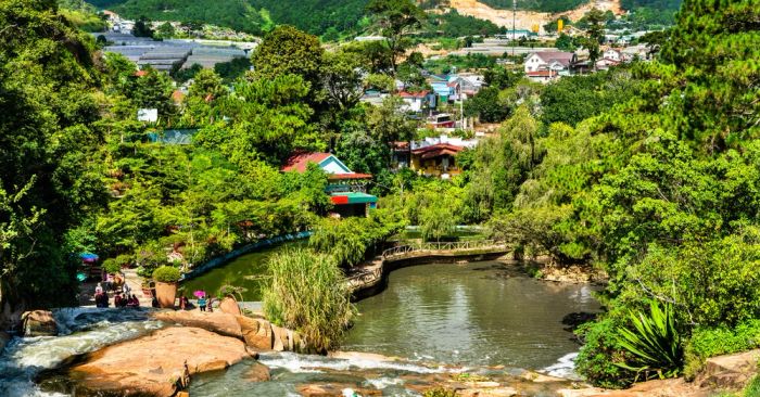 Cam Ly Waterfall in Da Lat offers a spacious exploration experience, with a unique and unparalleled beauty. Located about 2km west of the city center, Cam Ly Waterfall is formed by the convergence of two streams: one flowing from Xuan Huong Lake and another from the South. Nature at Cam Ly Waterfall is vibrant throughout the four seasons, with the rushing white foam of the water and the surrounding space adorned with a myriad of beautiful flowers such as bougainvillea, Salim flowers, and Thach Thao flowers.