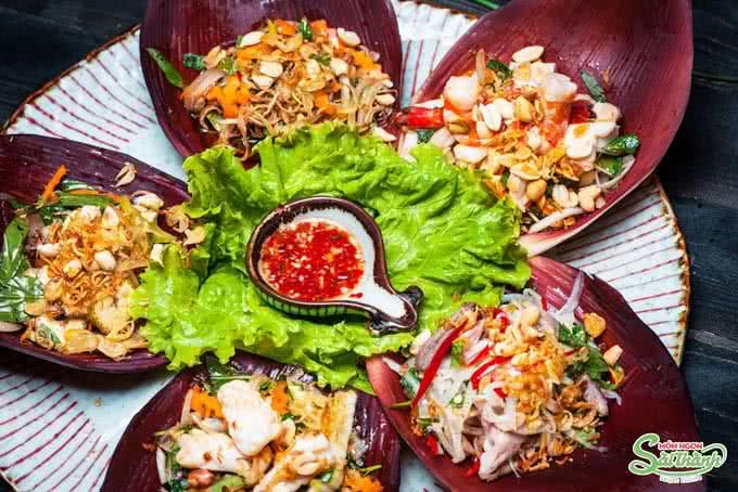 Southern salads offer a rich variety, often featuring a mix of shrimp, meat, and pig's ears, such as the flavorful shrimp and meat salad, beef compressed salad, chicken and jackfruit salad, dried mango salad, and banana flower clam salad. These dishes use raw or simply boiled ingredients, mixed with spices, to achieve a perfect balance of sweet and sour flavors. Five-color salad, not only delicious but also visually appealing, harmoniously combines various types of salads, making it an ideal appetizer to stimulate the taste buds with a blend of salty, sweet, sour, and spicy tastes. This salad incorporates protein from ingredients like clams, meat, fish, shrimp, squid, while also providing ample vitamins and minerals from assorted vegetables. It's a sophisticated and exquisite dish with five types of salads, each offering a unique taste and vibrant colors, meticulously decorated to create a delightful and festive atmosphere, as locals would say: 'That's the way it should be.'