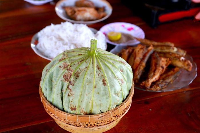 Delicious lotus leaf-wrapped rice must be cooked from dragon blood rice, a type of rice with red color, small, round grains, light, and slender for a better taste than any other rice. The dish is also combined with lotus seeds. The seeds are mixed with sesame salt, wrapped in lotus leaves along with rice, and steamed until cooked.
