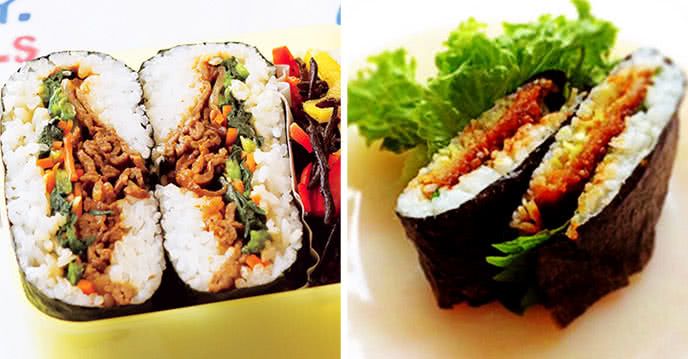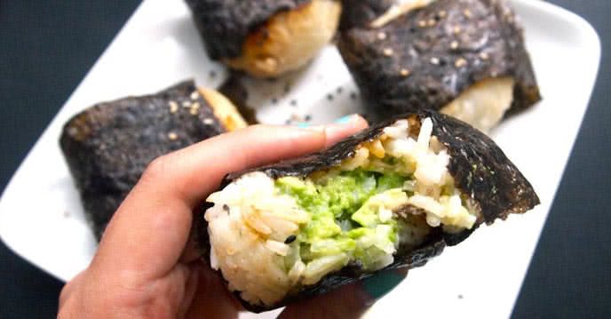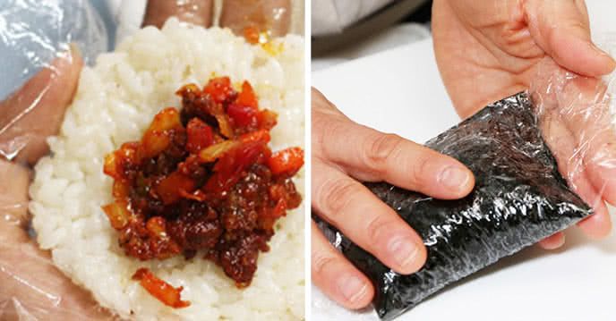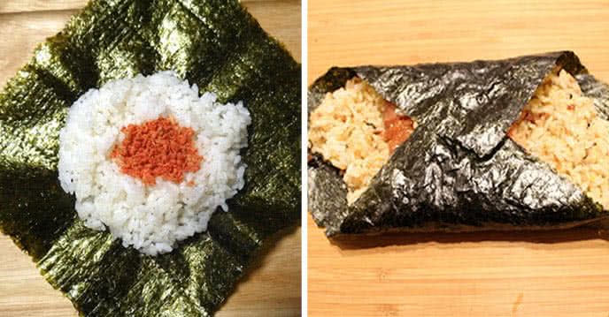 Traditional rice ball making involves shaping rice firmly into triangles, stuffing them, and then decorating them with a strip of seaweed. This method is intricate and somewhat time-consuming. If you're short on time, try using a whole sheet of seaweed, spread the rice, place the filling, and fold the seaweed corners over to wrap it up.