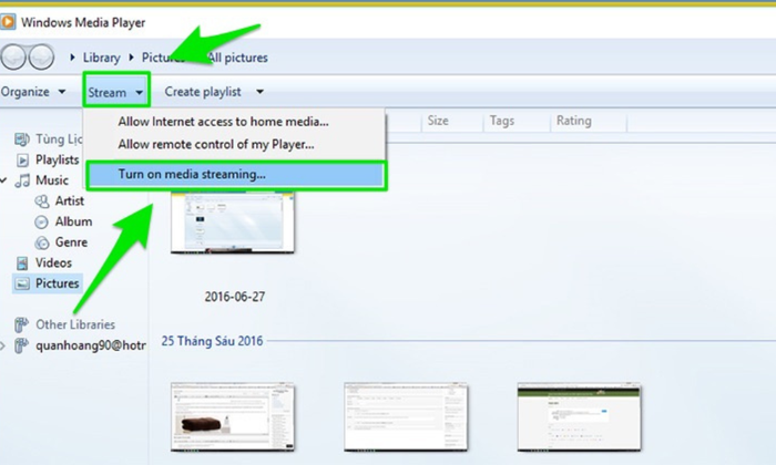 Step 1: Open Windows Media Player on your laptop -> select Turn on media streaming to enable sharing feature on your computer.