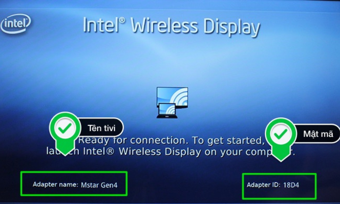 Step 1: On the TV, enable the Wifi Display feature (depending on the TV type, the function name will appear as Widi, Wifi Display, Wireless Display, Screen Share). Now you can see the TV name and password.