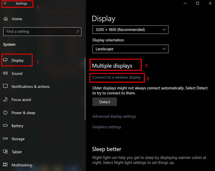 Step 2: Connect your laptop to the same Wifi network as the TV. Then, open Start Menu, click on the gear icon to open Settings -> System -> Display -> Multiple Displays. Next, go to Connect to a Wireless Display section, the system will start scanning for devices to connect. Finally, click on the name of the TV you want to connect to.