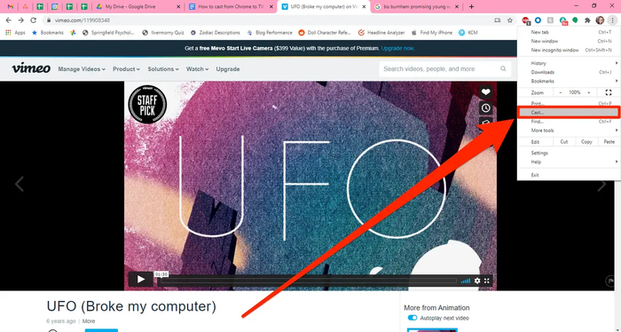 - Step 1: Click on the three-dot Menu icon at the top right corner of the Chrome browser and select Cast.