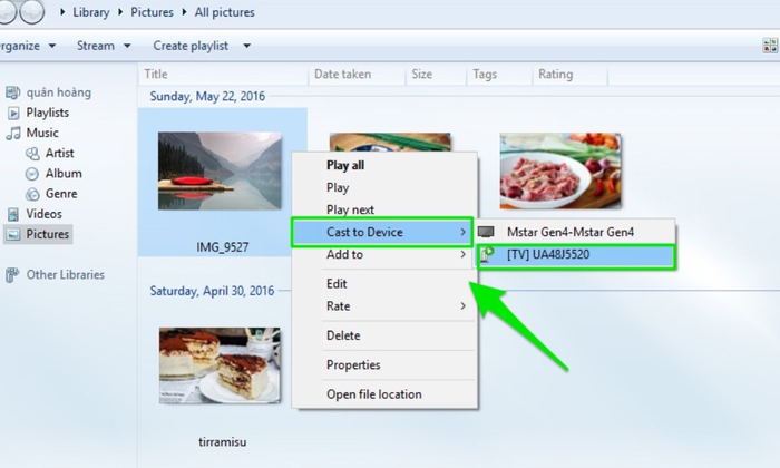 Enable sharing feature on your computer (Source: Internet)Step 2: To cast an image, select Pictures -> Right-click on the image you want to cast -> Choose Cast to Device -> Select your TV -> Your TV will display a prompt, select Agree/Accept/OK (depending on your TV model) -> The image on your laptop will then be cast to your TV.