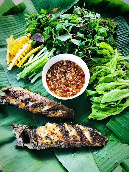 For grilled snakehead fish, you can enjoy it with various accompanying vegetables. Popular choices include lettuce, cucumber, coriander, sour star fruit, bitter banana, aromatic herbs (basil, cinnamon basil, laksa leaves, coriander, fish mint, culantro, water spinach, bean sprouts, chives, etc.).