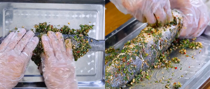 - Place the fish in a large pan, wear latex gloves to evenly spread the spice mixture on both sides of the fish, and stuff the remaining spice mixture into the fish's cavity.