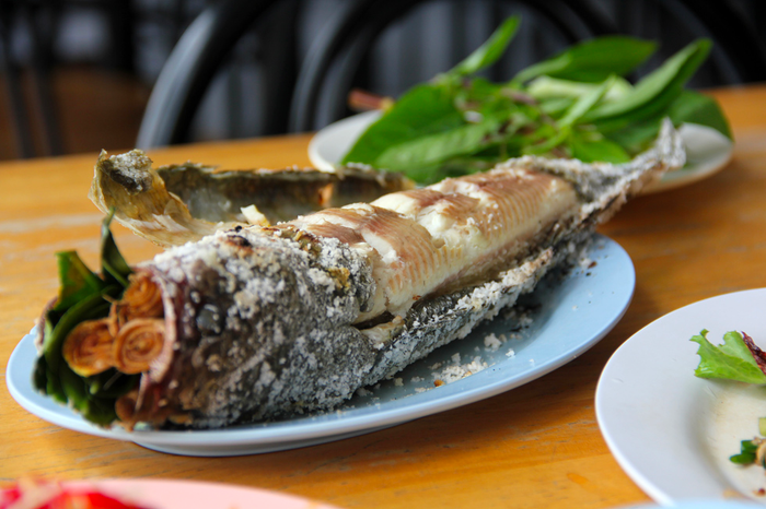 - Prepare a mango seed plate, place lettuce on top, and place the grilled snakehead fish on top.