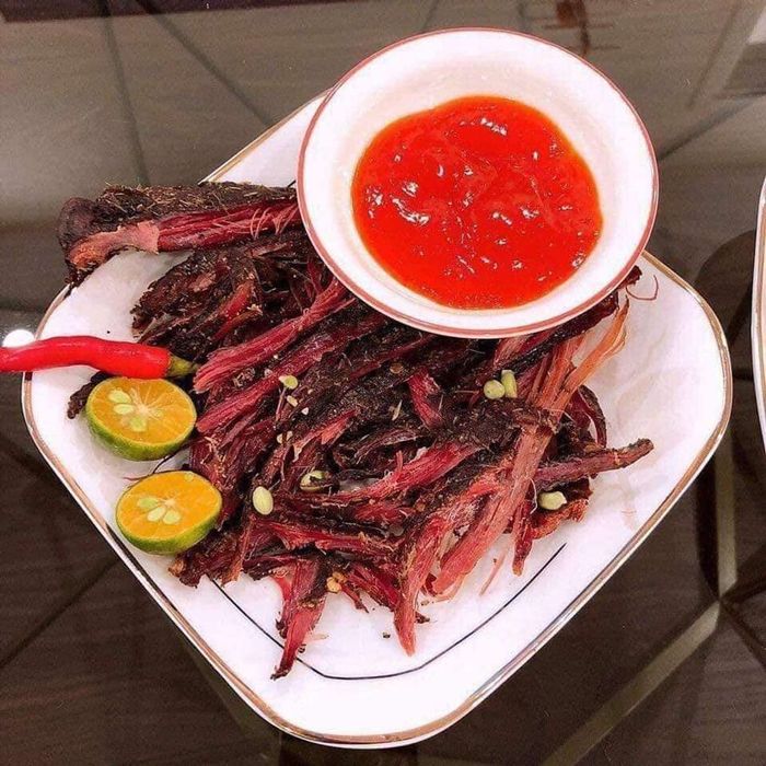 Stove-side buffalo meat is made from carefully selected fresh buffalo meat from the best parts. The meat is marinated with various spices such as salt, wild chili, and mac khen, then hung over a wood stove. The meat slowly dries and absorbs the smoky flavor, creating a unique taste that is unforgettable after just one bite.