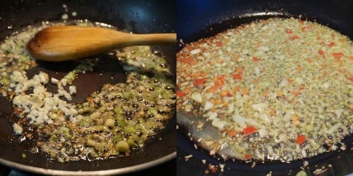 Step 2: Heat the pan, add 4 tablespoons of cooking oil and wait until the oil is hot, then add shallots and garlic and stir-fry until fragrant. Stir briefly until the shallots and garlic turn golden, then add lemongrass and continue to stir. When the lemongrass starts to smell fragrant, add chili. After the ingredients release their aroma, start removing half of the lemongrass, chili, and garlic into a bowl, leaving some in the pan. Be careful not to remove the cooking oil when scooping.
